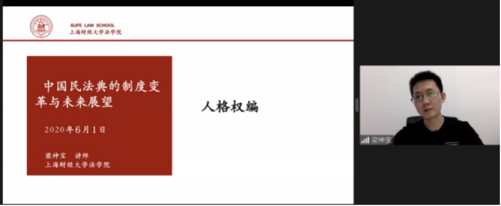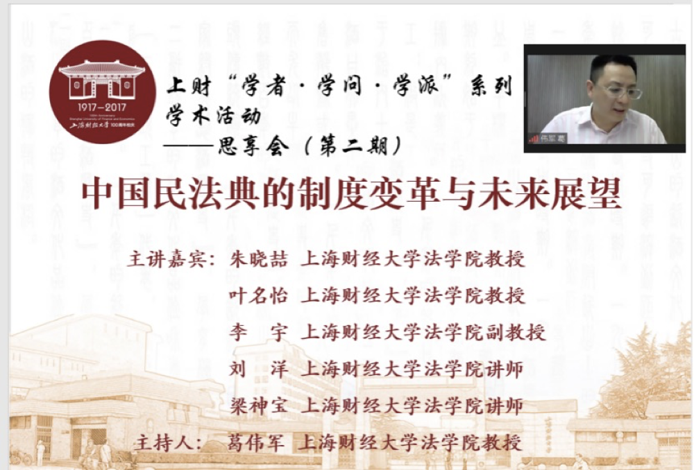 6月1日下午,由上海财经大学科研处主办的上财“学问·学者·学派”系列学术活动—思享会第二期以线上形式举办。本期“思享会”邀请到了我校法学院朱晓喆教授、叶名怡教授、李宇副教授、刘洋讲师和梁神宝讲师,围绕民法典的立法沿革及制度创新作了探讨汇报。论坛主持人由上海财经大学法学院副院长葛伟军教授担任。“宅”家不停学、在线“云”课堂,本期“思享会”吸引了四百余位校内外师生共同参与,新形势、新思路、新技术,打破了全校师生足不出户便能与校内专家学者即时互动的新局面。