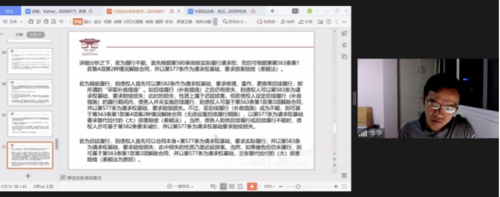 接着,李宇副教授以“合同编分则中的制度变革”为主题,以民法典中的现行规范为出发点,对买卖合同、借款合同、保证合同、租赁合同、保理合同、承揽合同、委托合同、居间合同、合伙合同等有名合同中的制度更新作了对照梳理。同时,李宇副教授还凭借其深度参与民法典立法的经验,为与会师生介绍了上述重大立法修改的背景与立法中的学说争论,并在此基础上,对新增制度的适用要件以及法律效果作了探讨。