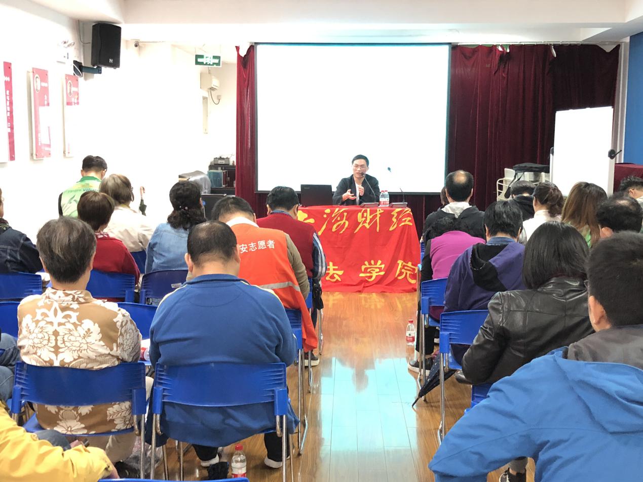 2018年11月7日早九点,上海财经大学法学院的同学肖峰、柯凯、王雅辉和申宇同学来到了四平街道社区文化活动中心进行普法宣讲。