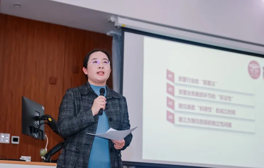 上海财经大学法学院副教授李睿随之以《资管领域融资犯罪概述》》为主题进行专业探讨。李睿副教授以资管行业的“前置法”引入,分析了资管业务融资环节的“非法性”、刚兑条款“利诱性”的成立时间、第三方刚兑担保的独立性问题,对资管领域融资犯罪的前沿问题进行了分析与探讨。