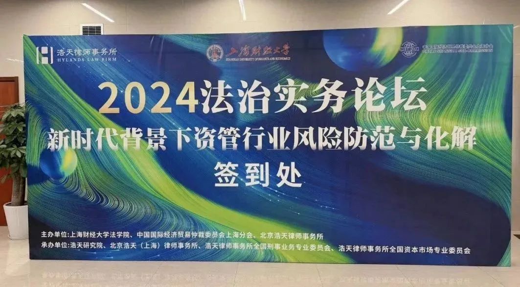 2024年1月12日下午13点,由上海财经大学法学院、中国国际经济贸易仲裁委员会上海分会、北京浩天律师事务所联合主办,浩天研究院、北京浩天(上海)律师事务所、浩天律师事务所全国刑事业务专业委员会、浩天律师事务所全国资本市场专业委员会承办的《新时代背景下资管行业风险防范与化解》法治实务论坛在上海财经大学科研实验大楼B115厅拉开帷幕。