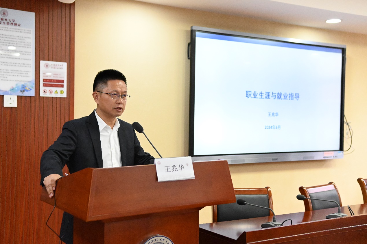 米其林中国区高级副总裁王兆华主旨发言的主题分为法科生专业对口的职业生涯和法科生就业指导思考两大板块。首先介绍了法科生对口的主要职业生涯和各职业的特征。其次,王总介绍了自己对于就业指导的思考,认为需要学校重视、外部生态的建设和运用等外部条件以及开放心态和保持终身学习心态的内部心理建设。