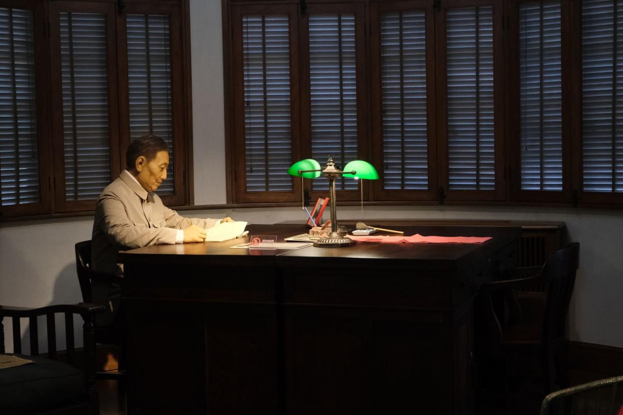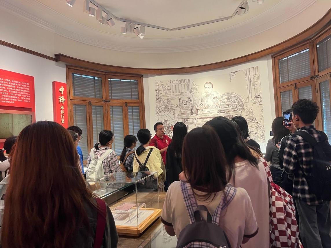 随着讲解的深入,大家步入二楼的展览区,这里复原了陈望道先生的书房,介绍了他的生平事迹和革命贡献。书房窗边,放置着陈望道先生端坐的蜡像,蜡像栩栩如生,一如生前工作的状态,让参观者仿佛穿越时空,与陈望道先生进行了一场“跨越百年的对话”。从陈望道先生的求学经历到革命斗争,再到他翻译《共产党宣言》的艰辛过程,每一个细节都让大家深受触动。