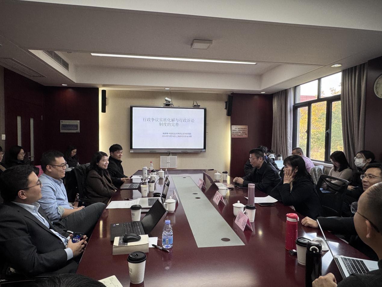 2024年12月15日下午,上海财经大学法学论坛第111讲在法学院211会议室顺利举办。本次讲座主讲嘉宾为中国政法大学教授、中国行为法学会软法研究会专业委员会副会长高家伟老师,讲座主题为“行政争议实质化解与行政诉讼制度的完善”。讲座由法学院张淑芳教授主持,上海财经大学法学院徐键教授、复旦大学法学院严益州讲师、同济大学法学院颜冬铌助理教授以及上海财经大学法学院黄圆胜讲师与谈。来自上海财经大学、上海师范大学、上海政法学院的二十余名师生参与旁听学习,现场气氛热烈,学术氛围浓厚。