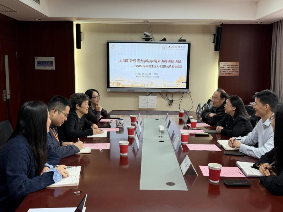2025年10月22日下午,上海对外经贸大学法学院党委书记乔檀、党委副书记商志民,副院长李磊,学生工作办公室主任杨扬一行到访上海财经大学法学院进行调研座谈。上海财经大学法学院党委书记罗山鸿,党委副书记、纪委书记齐宁,法学院学生办公室主任刘明,组织员郑丽出席座谈。
