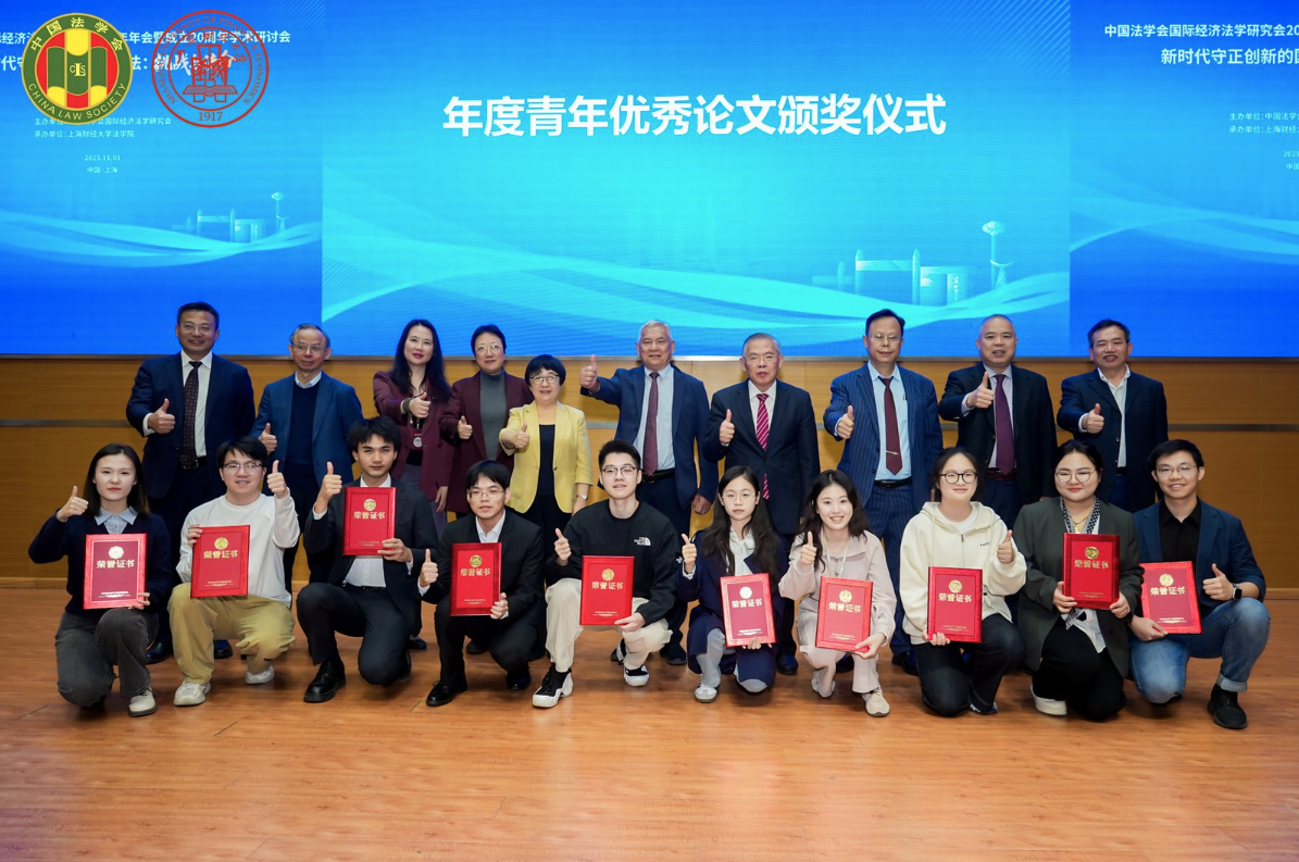 会议还设年度青年优秀论文颁奖仪式。对外经济贸易大学法学院教授、中国法学会国际经济法研究会副秘书长伏军宣读获奖论文名单,中国法学会国际经济法学研究会会长沈四宝为年度青年优秀论文颁奖。