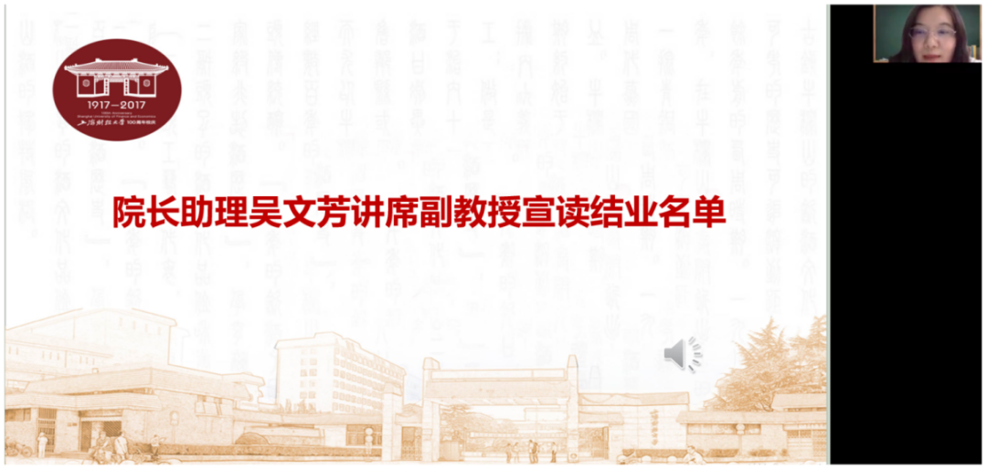 青春校树,灼灼庭花。时光荏苒,春去秋来。又到了一年学士方帽四处飞扬的毕业季,2022年6月24日下午一点,2018级英美法班全体成员齐聚云端,隆重举行上海财经大学法学院2018级英美法证书班结业仪式。除2018级英美法班全体同学们外,出席本次会议的有:法学院教授委员会主任郑少华教授、法学院院长宋晓燕教授、院长助理吴文芳讲席副教授以及众多教师代表。典礼由学工代表罗山鸿老师主持。