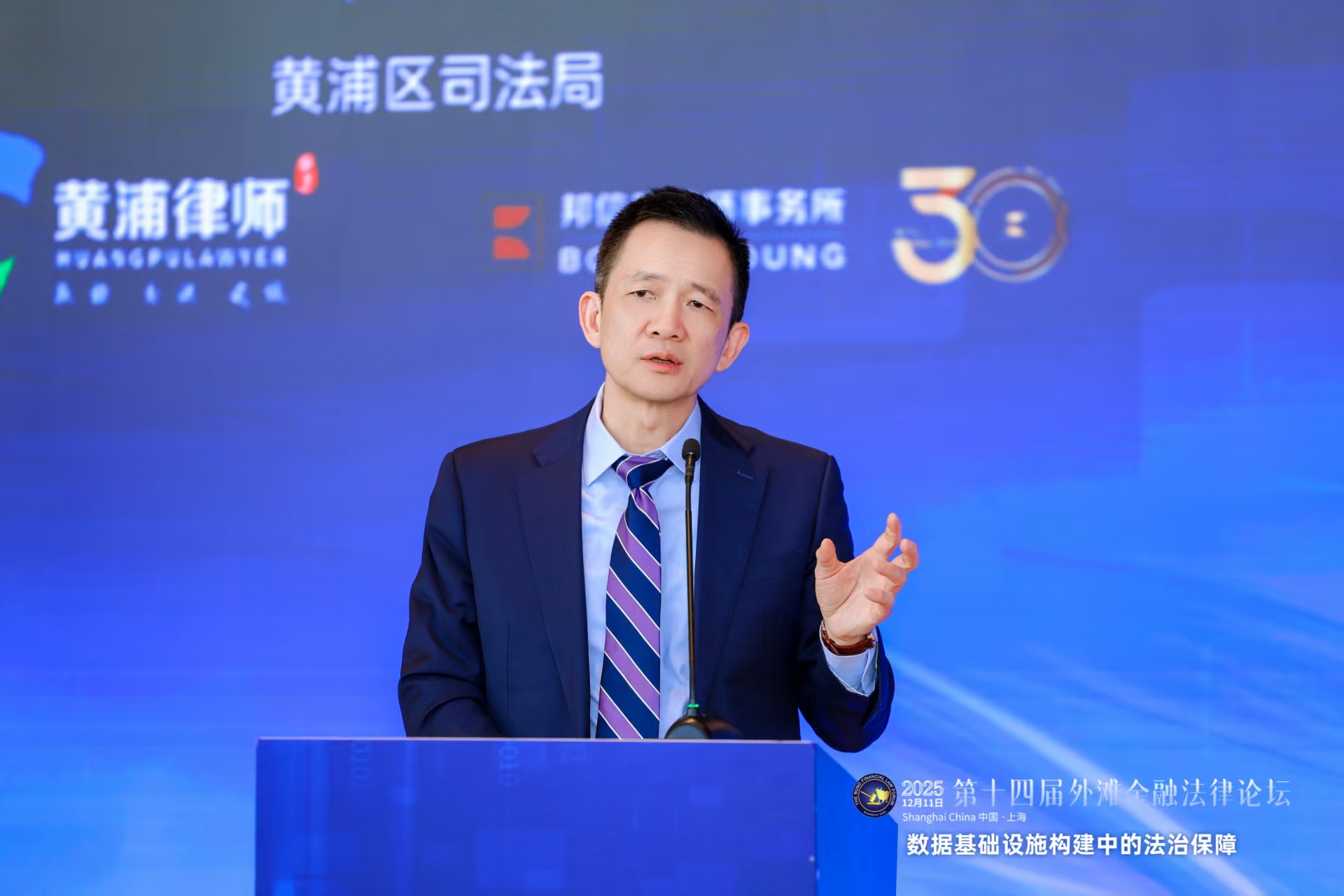 12月11日,第十四届“外滩金融法律论坛”在新天地举行。本届论坛以“数据基础设施构建中的法治保障”为主题,旨在凝聚共识,筑牢数据基础设施的法治根基,推动数字经济高质量发展。黄浦区委副书记、区长徐惠丽,市司法局党委书记、局长顾全,上海财经大学校长、党委副书记刘元春等出席论坛。黄浦区领导李铭、汤宏,上海市国际贸易促进委员会副会长、上海国际仲裁中心副主任马屹,黄浦区人民检察院检察长谈倩,市律师协会会长邵万权,以及企业界、法律界、学术界人士等参加论坛。