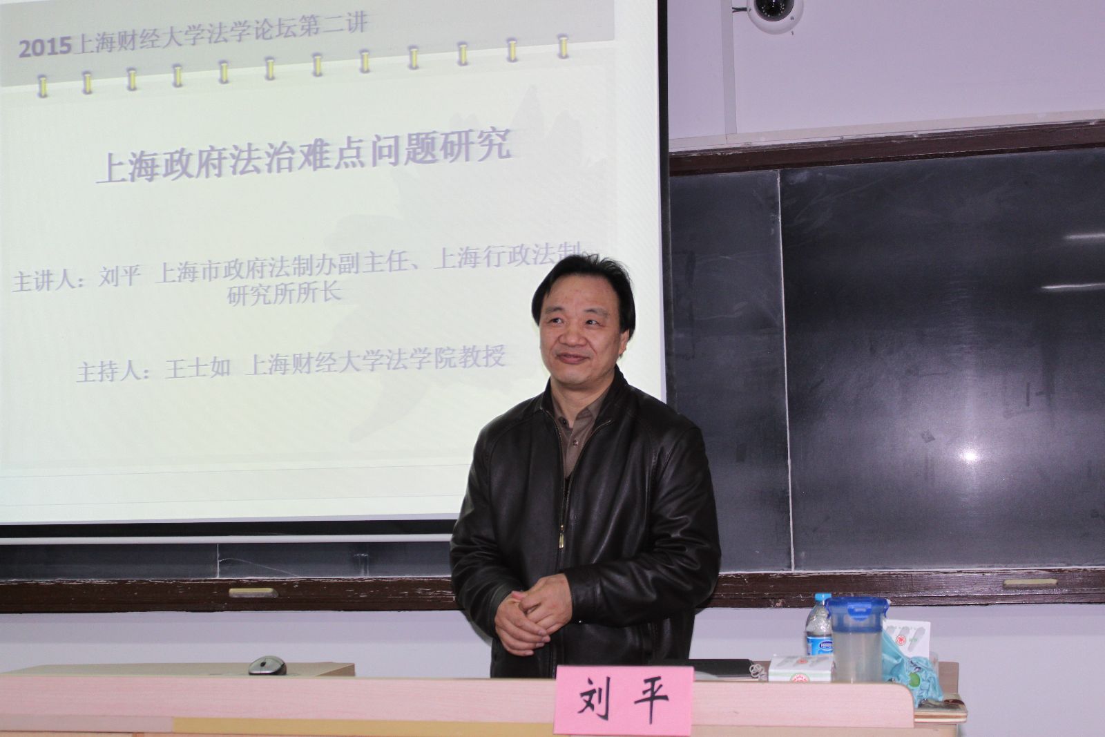 3月26日晚,2015上海财经大学法学论坛第二讲在国定路校区第二教学楼215教室举行。上海市政府法制办副主任、上海行政法制研究所所长刘平应邀作题为《上海政府法治难题问题研究》的学术讲座。上海财经大学法学院王士如教授主持讲座。