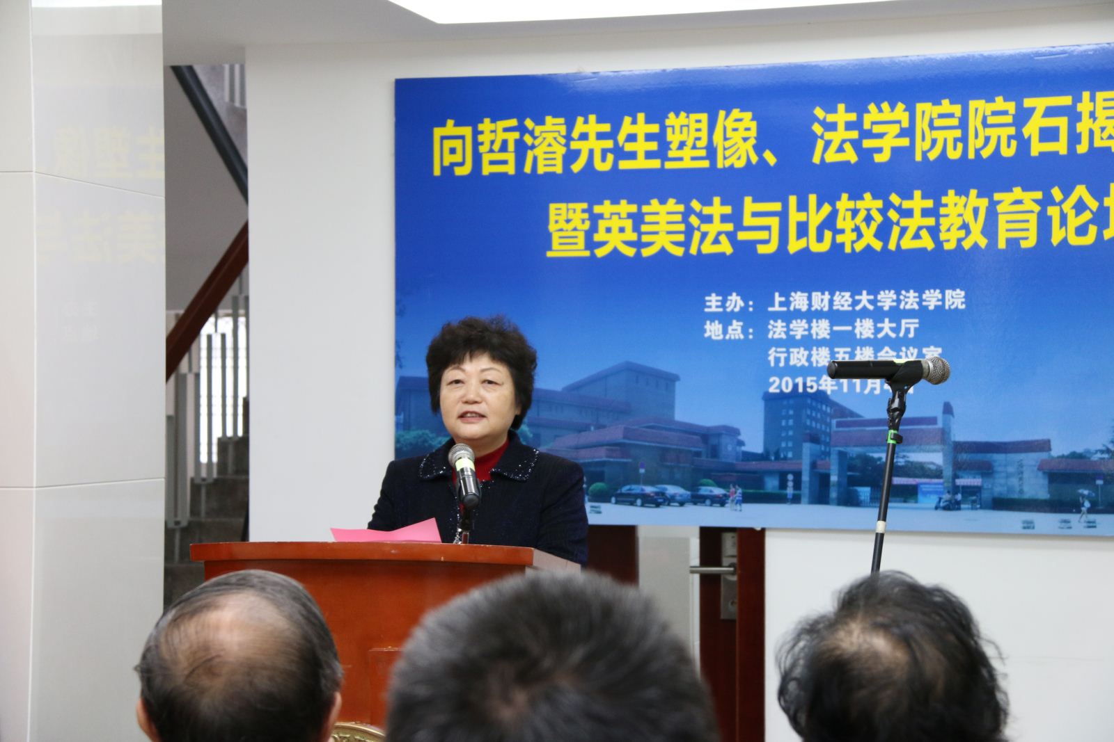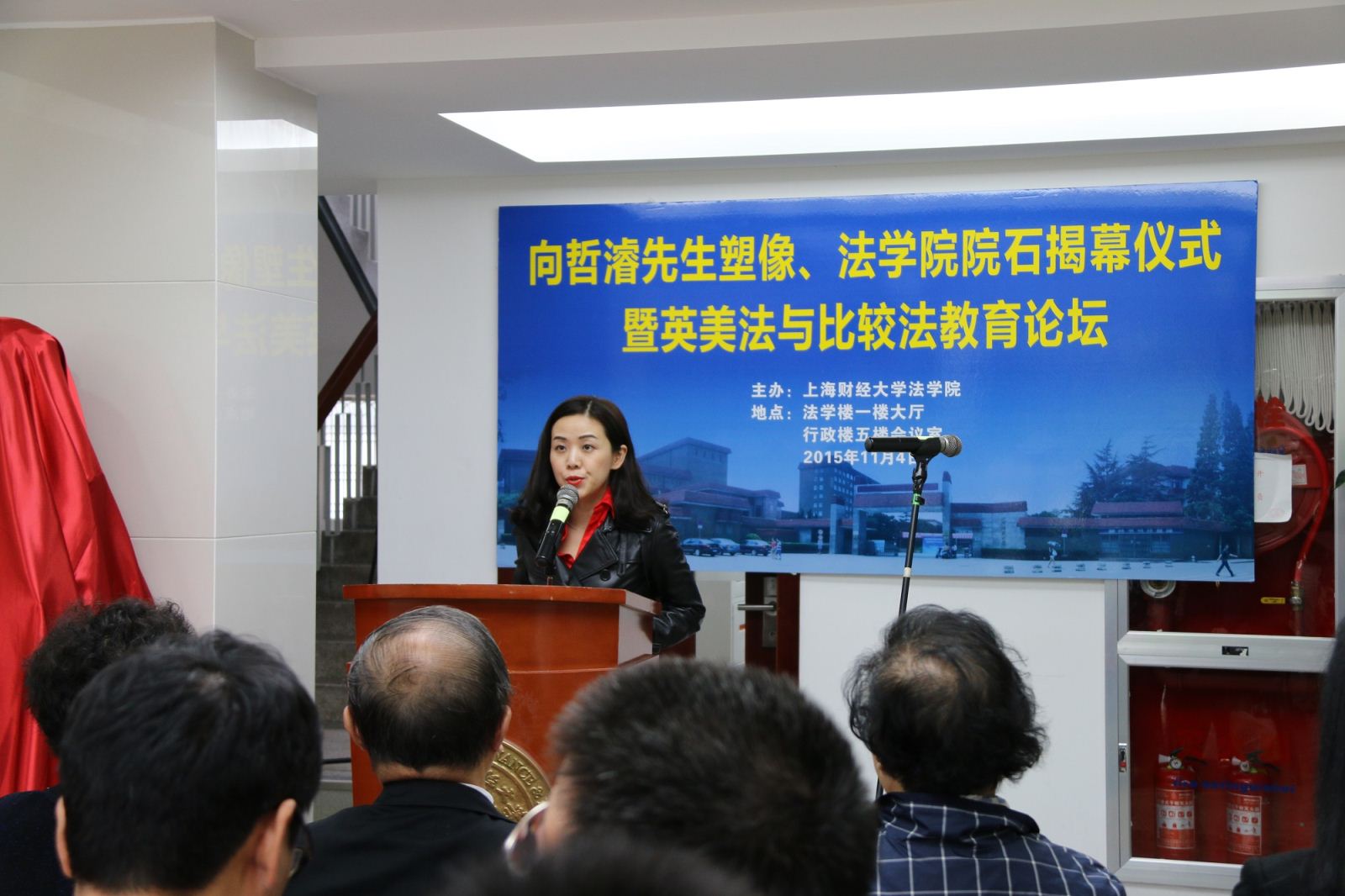 上海财经大学校长樊丽明在揭幕仪式上发表重要讲话,她回顾了向哲濬先生的生平,向先生于1892年生于湖南宁乡,作为优秀学生从长沙修业学校毕业后考入清华学堂的前身游美肄业馆,先后留学于美国耶鲁大学、乔治.华盛顿大学,回国后先后担任北京大学、北京交通大学、河北大学法律系以及北京法政大学教授。从1927年起,向哲濬又先后在司法部和外交部担任重要职务。1945年日本无条件投降后远东盟军总部在组建国际军事法庭的过程中,受中国政府选派,向哲濬先生出任检察官一职。在经过九个月的取证工作后,向先生作为中国检察官在法庭上,面对日本战犯的百般抵赖,用事实驳斥得对方哑口无言,在详实有力的起诉下远东国际军事法庭对日本战犯做出了合乎正义的合理判决。作为一位杰出的检察官,向哲濬先生把生命的最后时光无私的奉献给了我国的法学教育事业,回国之后,向先生婉拒政府最高法院检察署检察长、司法院大法官等职,先后在大夏大学、东吴大学、复旦大学法律系任教,之后调入上海财经大学的前身即上海财政经济学院任教,任学校基础部外语教研室主任直至荣休。他每天按时到学校上课,从不向人夸耀当年的经历,在年轻老师的眼中,他不仅是一位学者,更是一位和蔼可亲的长者。樊校长指出今年是世界反法西斯战争和中国人民抗日战争胜利七十周年,也是向哲濬先生诞辰123周年,在这个特殊的日子里,我们不能忘记在远东国际军事法庭上为审判日本战犯做出巨大贡献为祖国争得荣誉的中国检察官向哲濬先生。今天向先生的铜像安放在学校法学楼旁,希望法学院以此为契机,继承和发扬向先生开创的优良学风和学术传统,继往开来创新学科建设模式和人才培养模式,以建设一流法学院为目标,努力为我国人文科学事业做出更大的贡献。