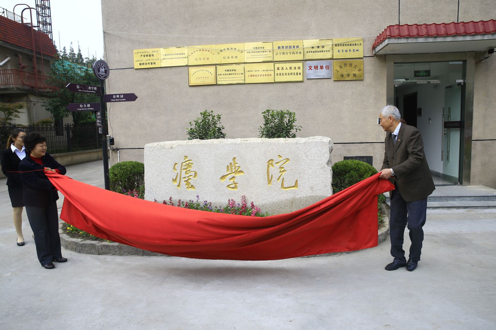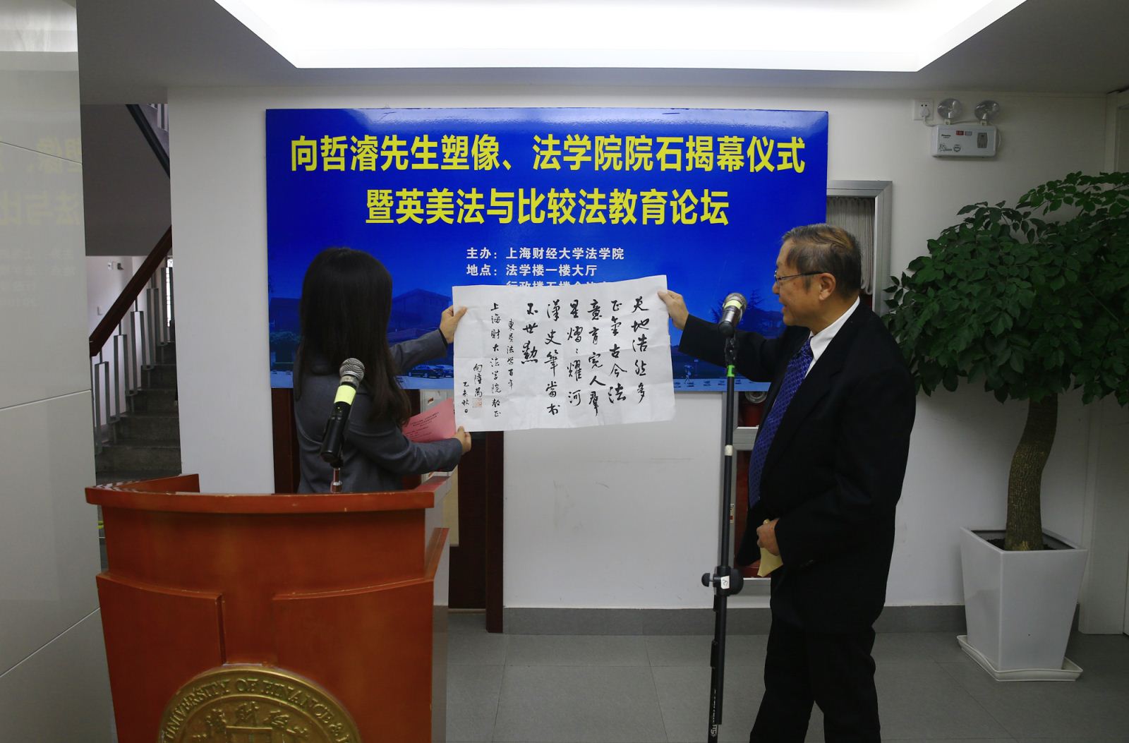 上海财经大学党委书记丛树海教授与向哲濬先生之子向隆万教授共同为向哲濬先生塑像揭幕,上海财经大学校长樊丽明教授和上海市卓越法律人才培养专家委员会主任、上海市法学会法理法史研究会会长、华东政法大学原副校长王立民教授共同为法学院院石揭幕。上海财经大学副校长黄颖教授和校长助理、组织部部长朱鸣雄教授为校友代表颁发了捐赠证书。