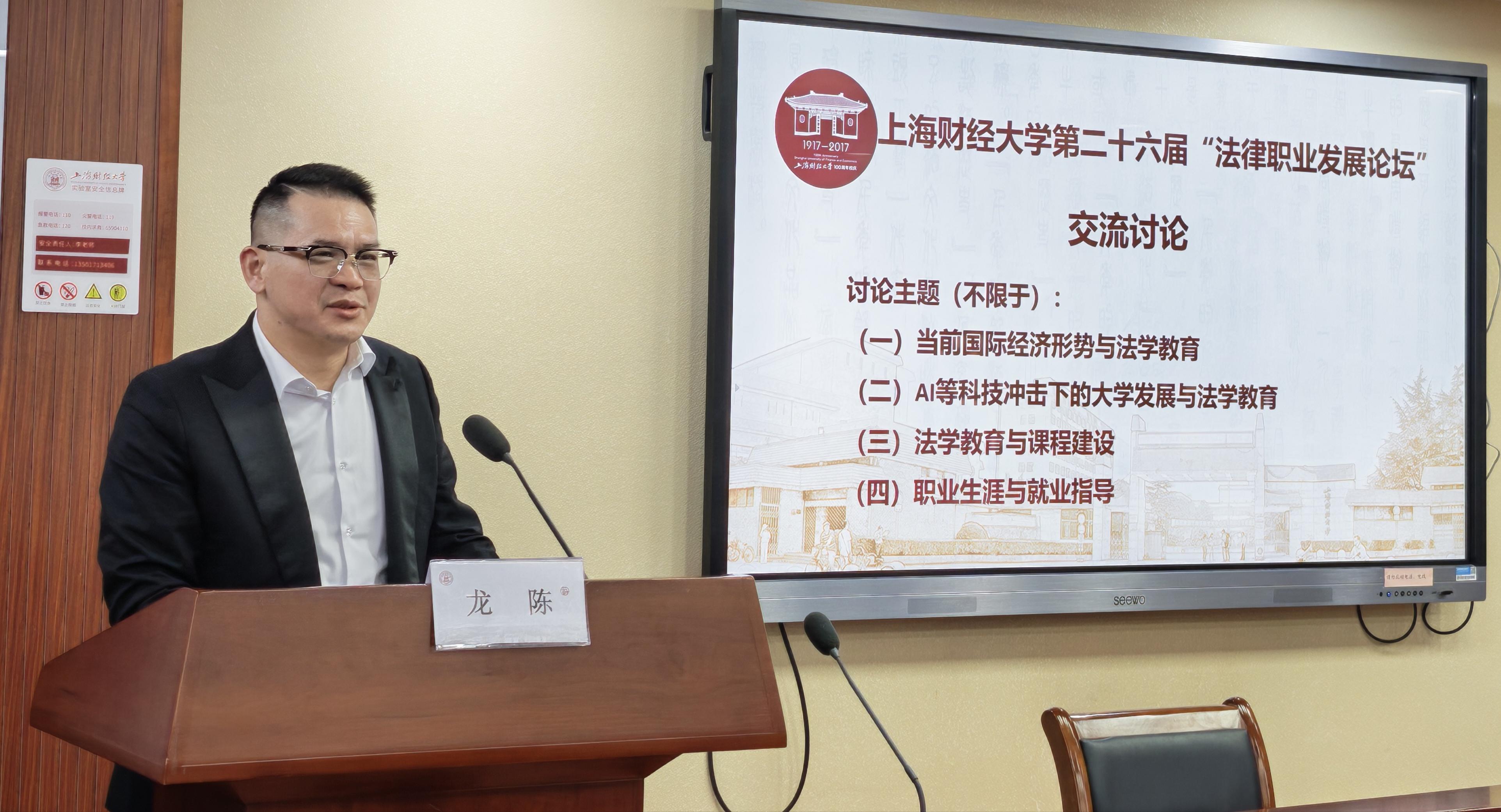 上海邦信阳律师事务所权益合伙人、上海市长益公益基金会龙陈理事长强调法律职业必须坚守对规则的尊重与专业监督,这是构建行业信任的基础,他指出AI虽无法完全替代法律人,但能有效减轻实务负担,使从业者更聚焦于战略性工作。此外,他分享了其在公益领域的显著成果,并表示愿意为上海财经大学法学院的学生提供更多实践机会,助力提升法学院学生的职业化培养水平。
