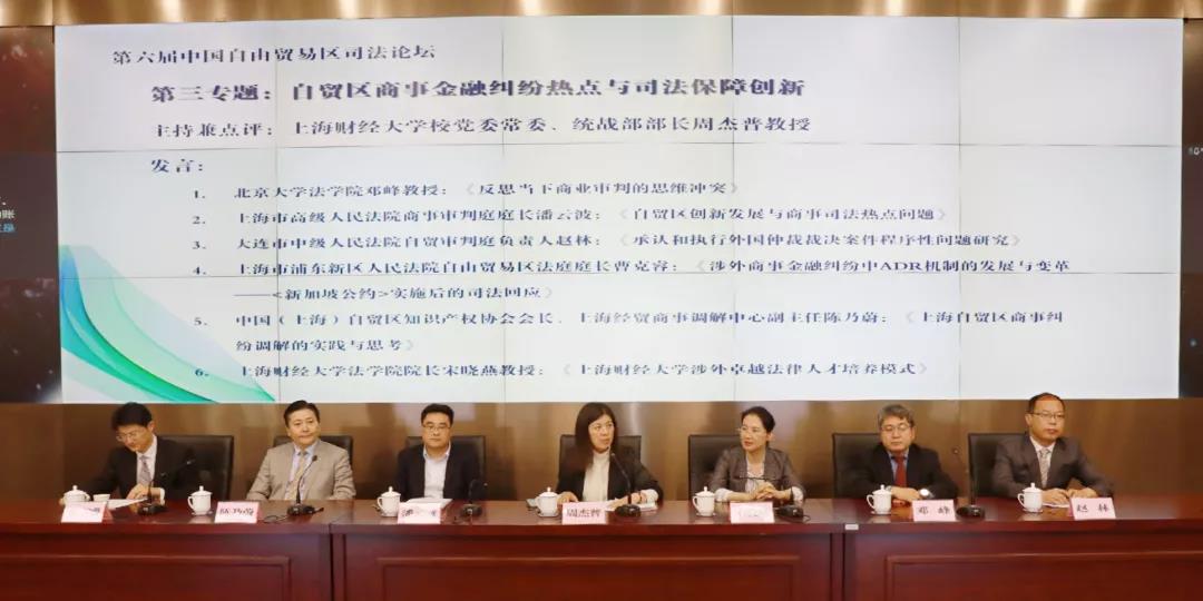 在“自贸区商事金融纠纷热点与司法保障创新”专题中,与会人员分享了关于商事审判的思维冲突、自贸区商事司法热点、承认和执行外国仲裁裁决案件程序性问题、商事调解制度的发展、《新加坡公约》实施后涉外商事金融ADR机制的司法回应、涉外卓越法律人才培养等方面的研究成果。