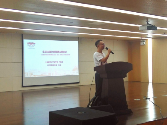 宣讲团队则另行赶赴吴江区湖滨华城社区服务中心进行生活垃圾分类管理法制宣讲。吴江区湖滨华城社区居委会的工作人员协助组织了活动的开展,吴江区城管局马永伟副局长出席了此次活动。首先,由钟扬民博士通过对江浙沪生活垃圾分类管理相关规定的比较,带领社区居民解读垃圾分类相关规定,了解相关法律责任,引导社区居民正确地进行垃圾分类处理。随后,由黄冠宁硕士对国外垃圾分类情况进行介绍,通过对中日两国垃圾分类方式的对比,深化社区居民对垃圾分类的认识。最后,宣讲团队还进行了游戏互动环节,居民们纷纷踊跃举手回答关于垃圾分类的知识,场面十分活跃。