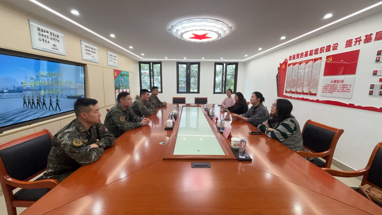 为深入学习贯彻习近平新时代中国特色社会主义思想,进一步加强基层党组织建设,推动军地党建深度融合,4月8日,上海财经大学法学院院长宋晓燕、党委副书记齐宁、学院办公室主任姚永美、组织员郑丽、本科生第一党支部书记葛晓青一行赴“南京路上学八连模范中队”--武警上海总队执勤第四支队执勤十中队开展党建联建交流活动,共同探索新时代党建工作新路径。