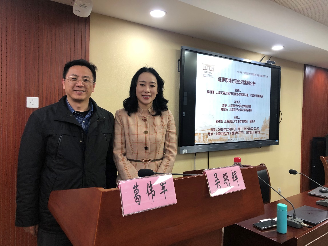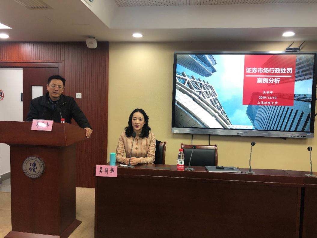 2019年12月10日晚18点,上海财经大学财经法律论坛第174讲于法学院116会议室举行。本次论坛由上海证券交易所巡回协作部副总监、行政处罚委委员吴明晖担任主讲人,讲座主题为《证券市场行政处罚案例分析》。上海财经大学法学院副院长葛伟军教授担任主持人。上海财经大学法学院樊健、夏戴乐老师以及众多学生参加了此次论坛。