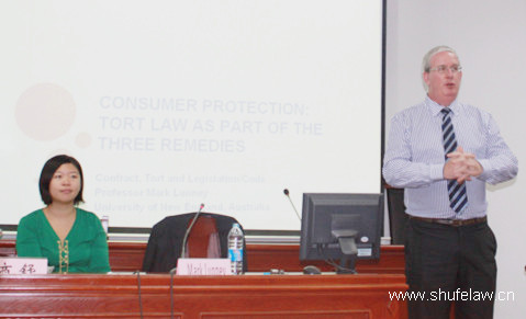 On the evening of Sept. 26, 2013, Law School Professor Mark Lunney from University of New England brought SHUFE Law students an inspiring speech entitled "Legal categories and the different remedies in consumer protection law: contract, tort and statute/code compared". Dr. Shang Shu from SHUFE Law hosted the lecture.