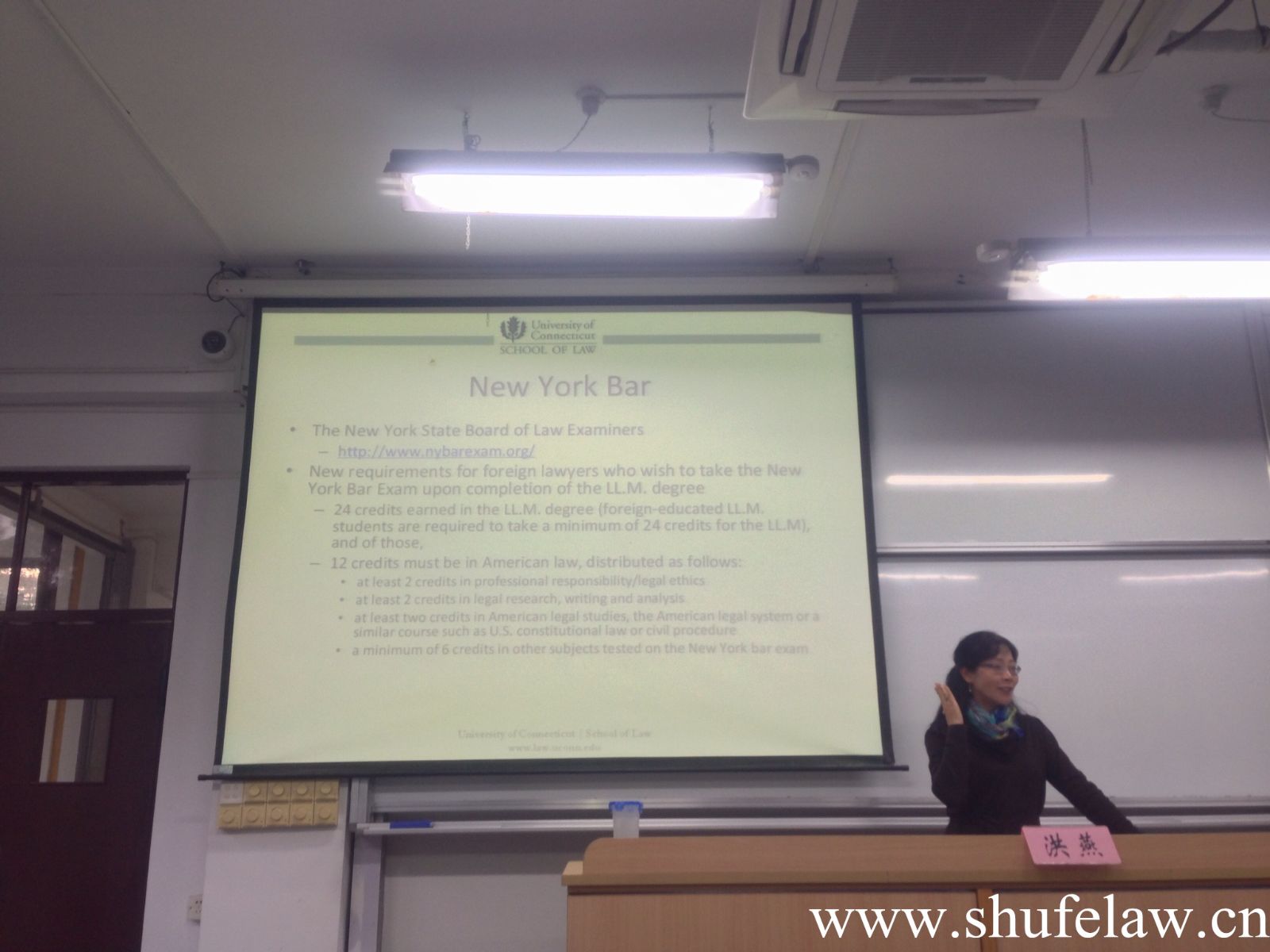 “How to Apply Law School in United States?” Professor Hong Yan, the Assistant Director of Research in Insurance and Financial Services from Law School of University of Connecticut gave SHUFE Law students a vivid speech for recruitment of University of Connecticut on 4th December, 2013. Professor Ma Hong, the Vice Dean of SHUFE Law, hosted the session.