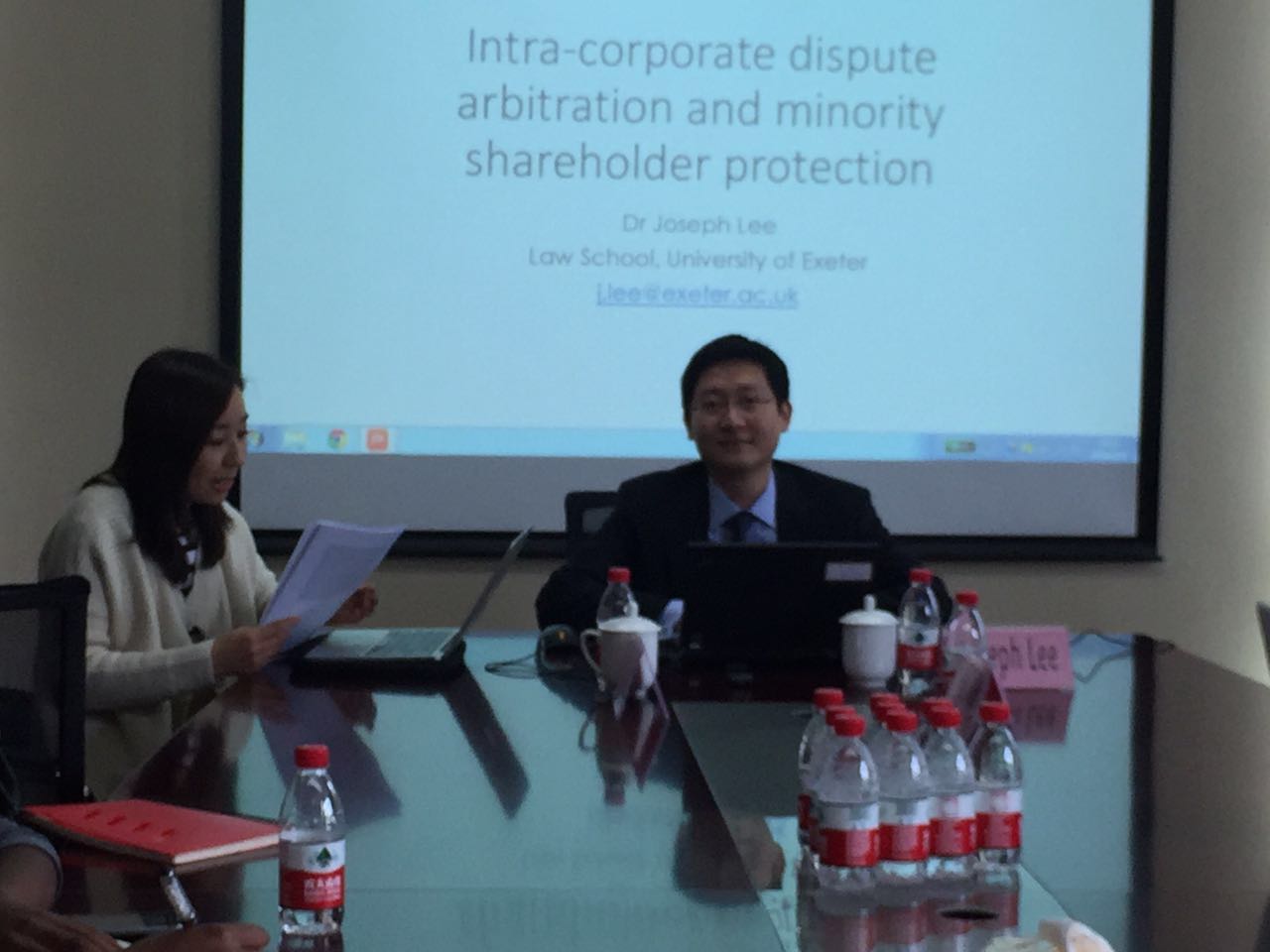 In the afternoon of April, 8th, 2016, the fourth overseas legal forum in 2016 was held in 2nd-floor conference room in the law school building. Dr. Lee Joseph, senior lecturer at the University of Exeter, UK, was invited to Shanghai University of Finance and Economics to give a lecture about “Intra-Corporate Dispute Arbitration and Minority Shareholder Protection: A Corporate Governance Perspective” This lecture was held by Teacher Pan Hong of law school. Vice Dean, vice professor Ge Weijun, Lecturer Fan Jian and some doctors attended this lecture.